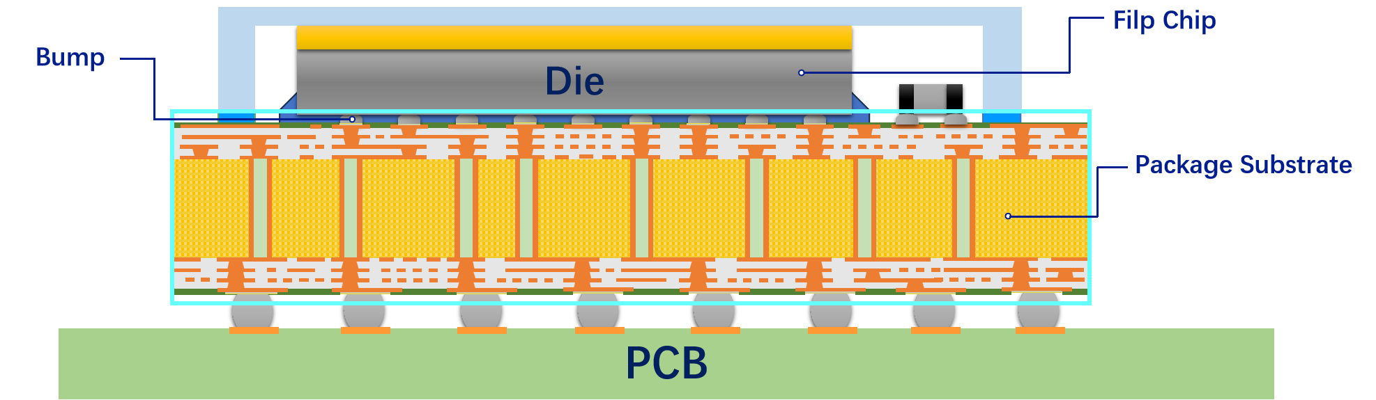 FCBGA载板FCBGA Substrate产品介绍Product Introduction 产品一般采用胶膜增层(Build-up Film Lamination)工艺,线路形成使用半加成(SAP)工艺。代表产品有倒装芯片封装形式的FCBGA(Flip Chip Ball Grid Array)封装载板。 该类产品特点:大尺寸、高多层、高密度;用于大算力(HPC)的应用,如GPU、CPU、FPGA、AI计算、5G/6G等场景。 The substrates stack up with Build-up Film(such as ABF,Ajinomoto Build-up Film),and the circuits form by Semi-Add Process(SAP). Representative application such as FCBGA packaging by Flip Chip. The characteristics of this kind of substrates: large unit size、high layer counts、high density interconnecting, Applying to High Performance Computing(HPC) applications, such as GPU, CPU, FPGA, AI, 5G/6G. | ![]() |